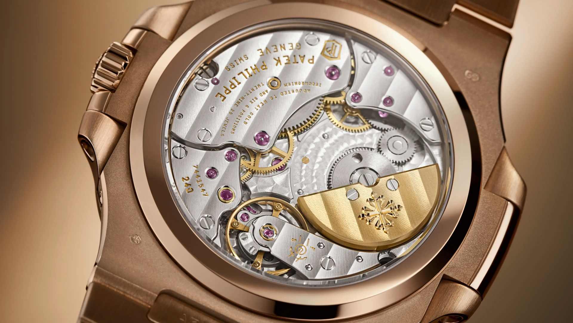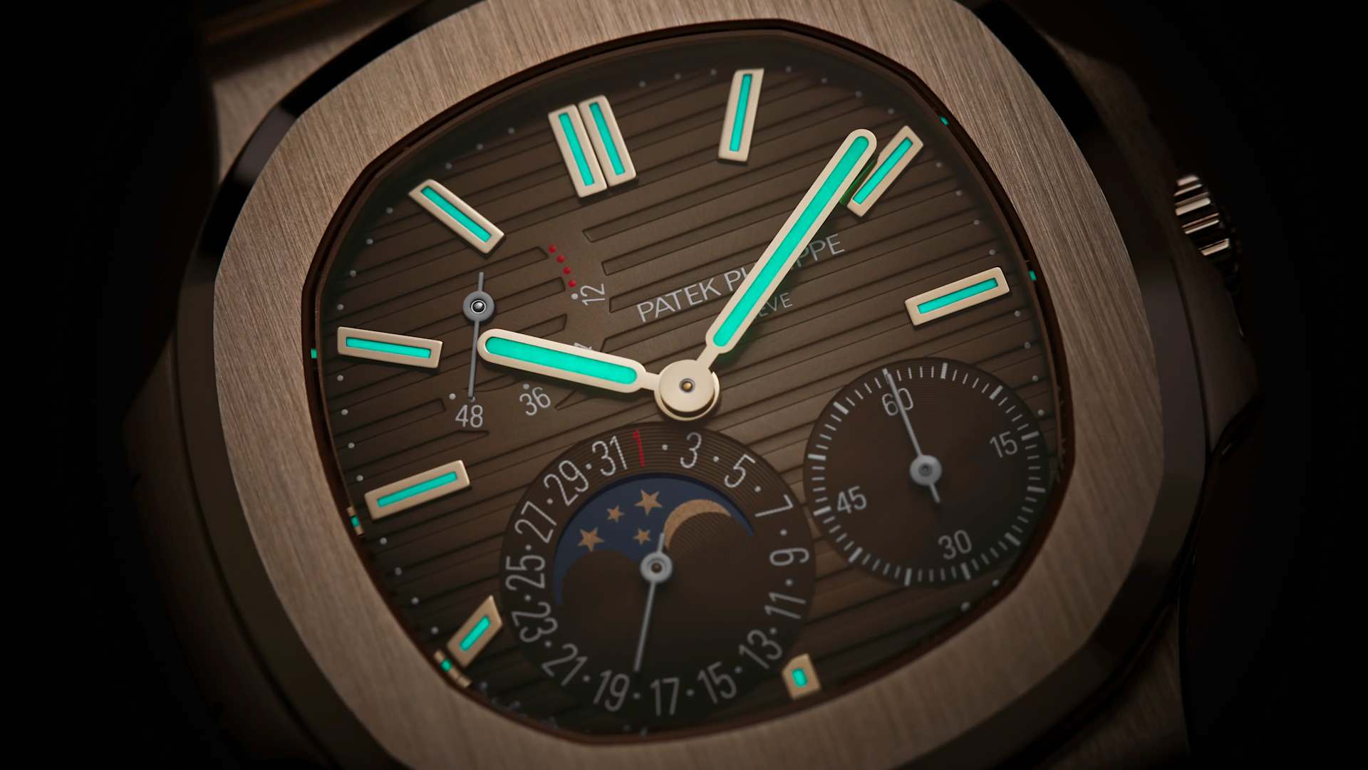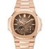 O famoso Nautilus com data, fases da lua e indicador de reserva de marcha irradia uma harmonia esportiva e elegante, combinando caixa e pulseira em ouro rosa com mostrador marrom sunburst com aro preto em degradê. A disposição assimétrica das funções no mostrador confere ao relógio uma aparência original e única.