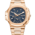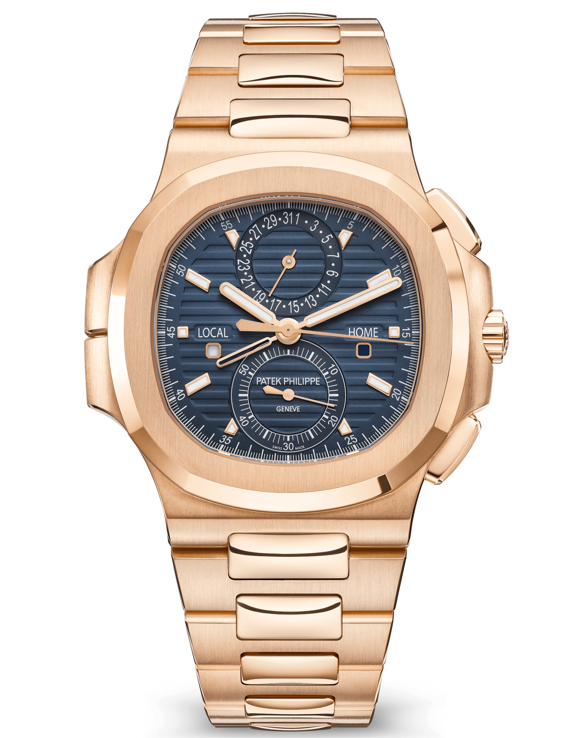 Apresentando um cronógrafo flyback automático, visor Travel Time e indicação de data por ponteiro, juntamente com a hora local, este Nautilus complexo combina o brilho do ouro rosa com um mostrador azul sunburst. O movimento do cronógrafo combina tradição (tração por roda de coluna) e inovação (embreagem de disco vertical)