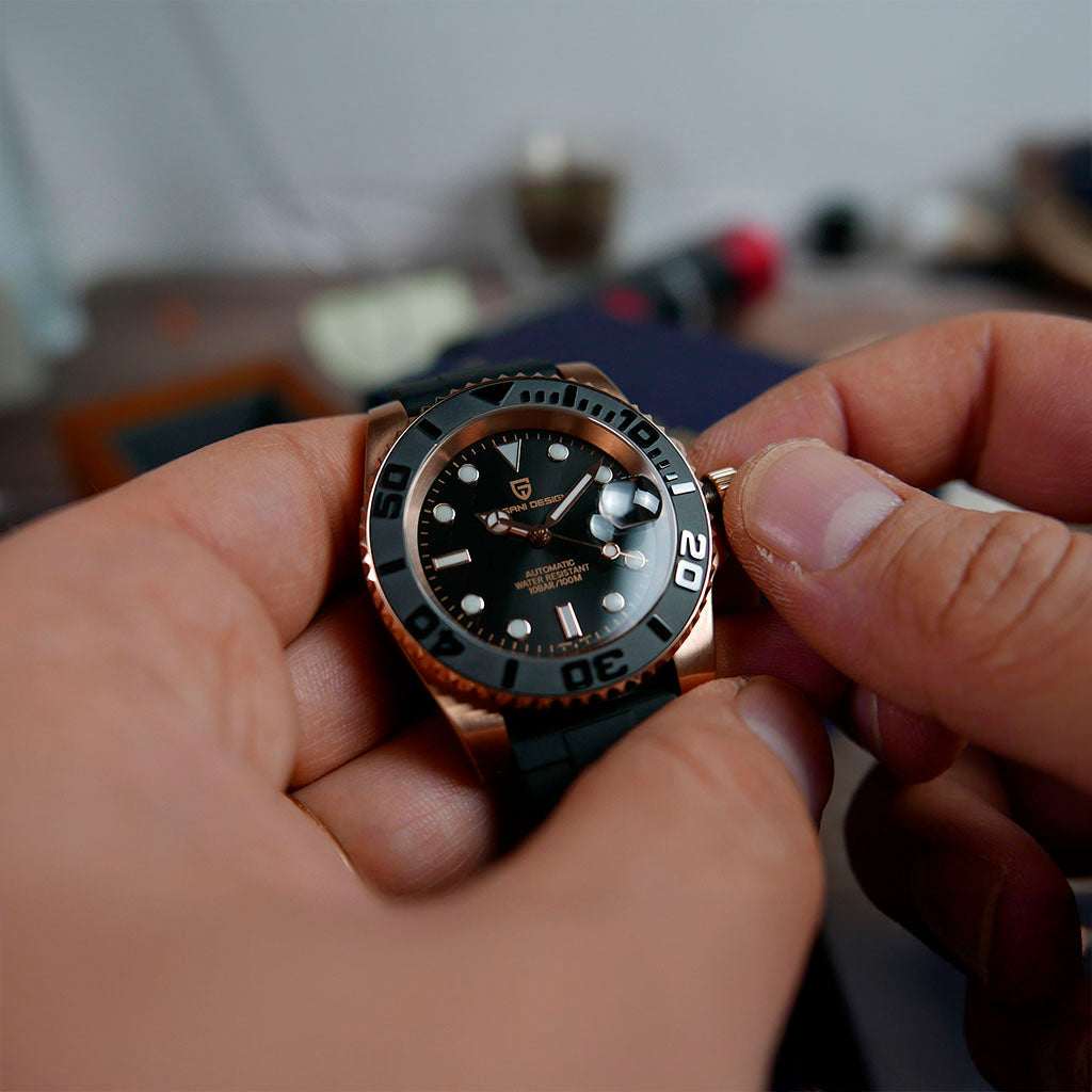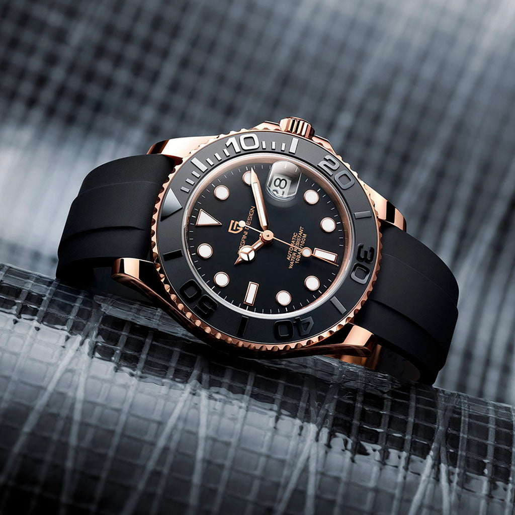 Características: Modelo: Pagani Explorer Material: Aço inoxidável Material do visor: Cristal de safira Material da pulseira: Borracha Diâmetro do visor: 40 mm Espessura do estojo: 13 mm Comprimento da pulseira: 22 cm (ajustável) Profundidade de resistência à água: 100 metros Movimento: Mecânico automático