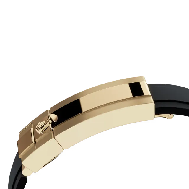 Esta lâmina está sobremoldada com um elastômero preto de alto desempenho que resiste bem às agressões ambientais, possui uma grande durabilidade e é perfeitamente inócuo para o usuário. Para aumentar o conforto, a face interna da pulseira Oysterflex contém um sistema patenteado de almofadas que estabilizam o relógio no pulso, com um fecho de segurança Oysterlock em Ouro amarelo 18 quilates. Ela também dispõe do sistema de extensão Rolex Glidelock, desenvolvido pela marca e patenteado. Esse engenhoso dispositivo de cremalheira, integrado ao fecho, permite um ajuste fino de seu comprimento — sem necessidade de nenhuma ferramenta — em cerca de 15 mm, por estágios de aproximadamente 2,5 mm.